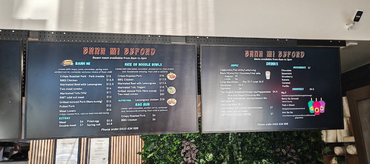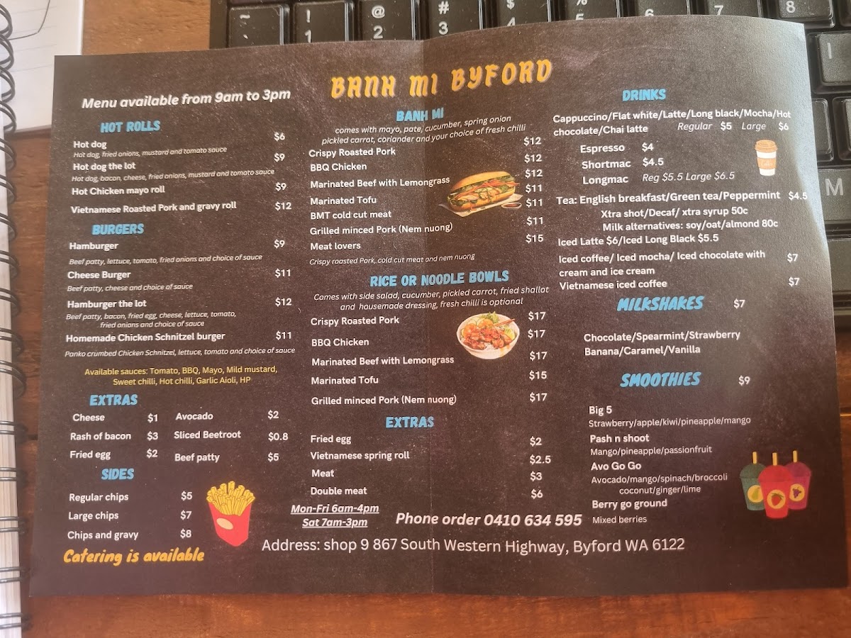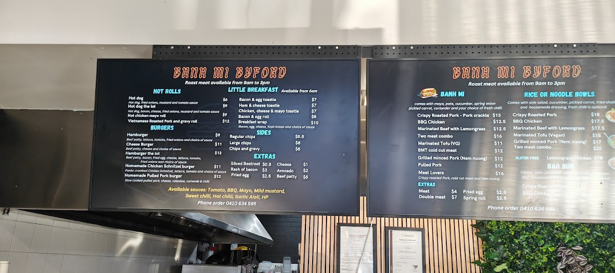 From a reviewer’s perspective, the menu at Banh Mi Byford offers a well-rounded and comforting mix of Vietnamese classics and Aussie favourites, making it easy to find something for any time of day. The Hot Rolls section stands out for its hearty appeal, with options like Hot Dog, Hot Dog The Lot, Hot Chicken Mayo Roll, and the flavourful Vietnamese Roasted Pork And Gravy Roll, all ideal for a quick, satisfying bite. Breakfast is equally inviting under Little Breakfast, where simple but reliable choices such as Bacon & Egg Toastie, Ham & Cheese Toastie, Chicken, Cheese & Mayo Toastie, Bacon & Egg Roll, and Breakfast Wrap cater to morning cravings. For something more filling, the Rice Or Noodle Bowls showcase variety and balance, featuring Crispy Roasted Pork, Bbq Chicken, Marinated Beef With Lemongrass, Marinated Tofu, and Grilled Minced Pork. The menu also leans into classic comfort with Burgers like Hamburger, Cheese Burger, Hamburger The Lot, Homemade Chicken Schnitzel Burger, and Homemade Pulled Pork Burger, which pair perfectly with Sides such as Regular Chips, Large Chips, or Chips And Gravy, plus handy Extras like Sliced Beetroot and Rash Of Bacon. For a lighter or more traditional Vietnamese touch, Bao Bun options including Crispy Roasted Pork and Bbq Chicken complement the core Banh Mi range of Crispy Roasted Pork, Bbq Chicken, Marinated Beef With Lemongrass, Pulled Pork, and Marinated Tofu. Drinks round things off nicely, from Cappuccino and other Coffee choices like Shortmac, Espresso, and Long Macchiato, to refreshing Milkshakes such as Chocolate and Banana, vibrant Smoothies like Big 5, Pash N Shoot, Berry Go Ground, and Avo Go Go, and chilled options including Iced Latte and Iced Long Black. Overall, the menu feels thoughtfully curated, offering familiarity, variety, and comfort in equal measure.